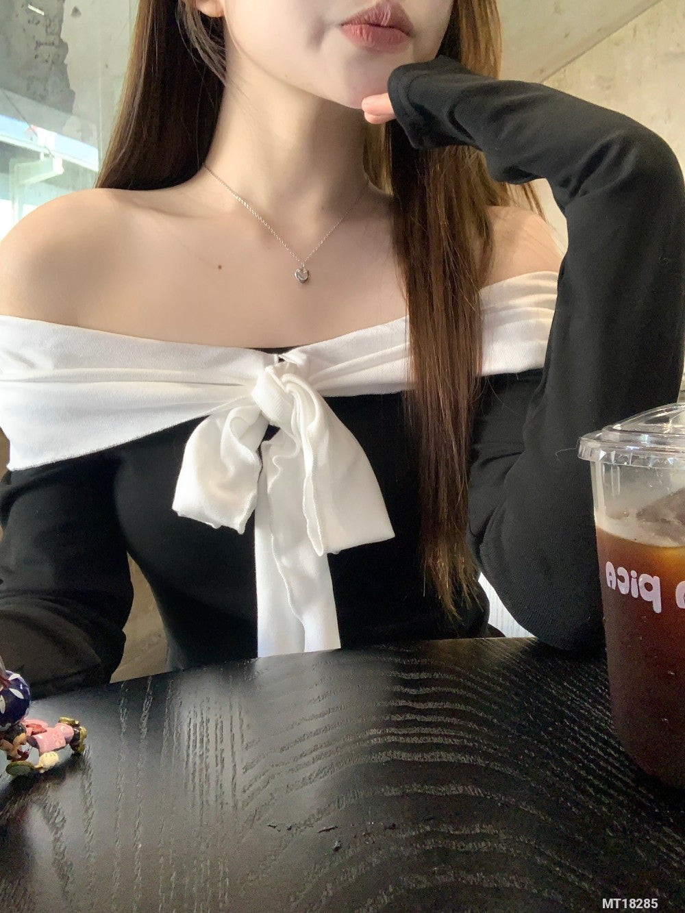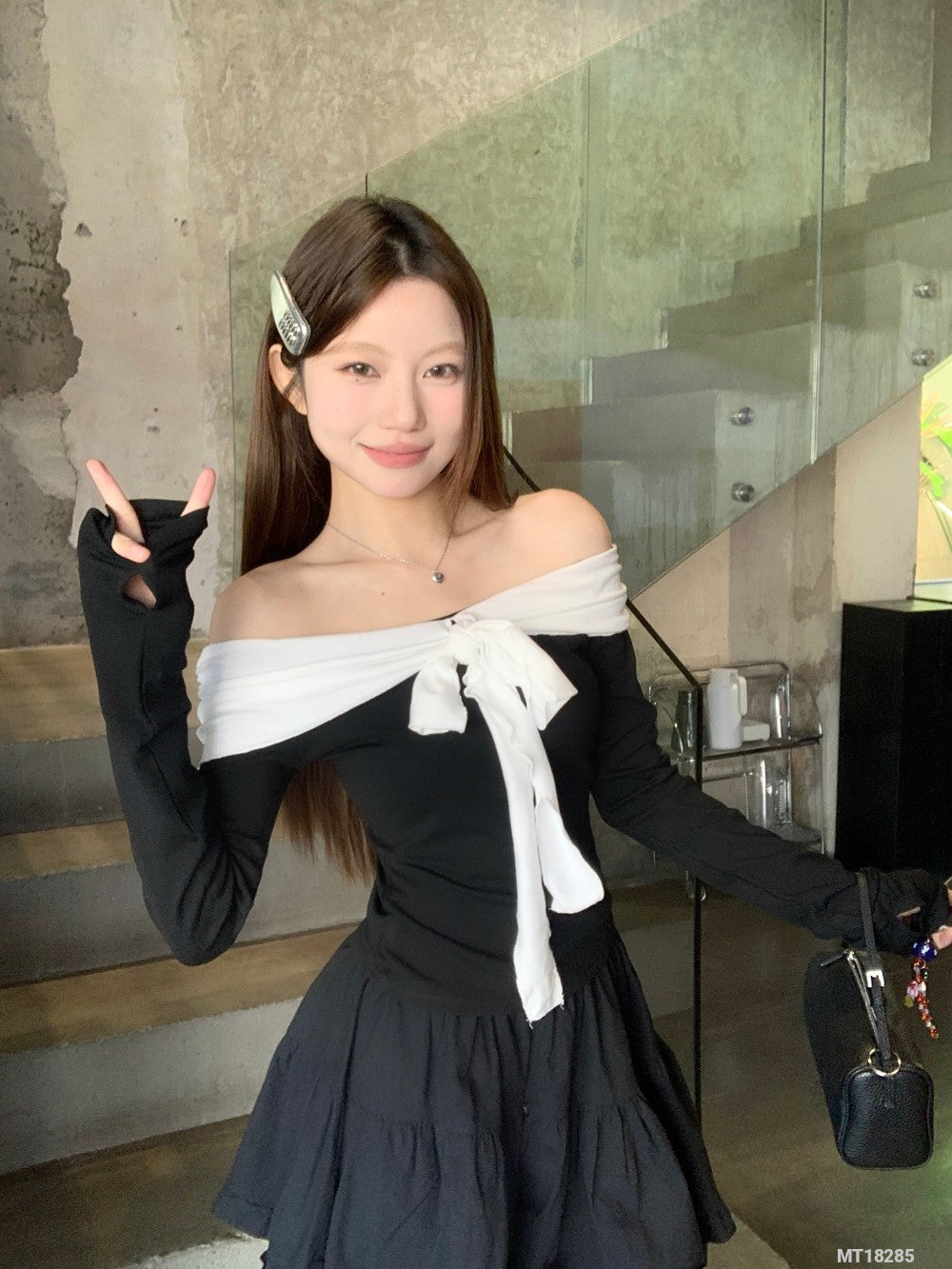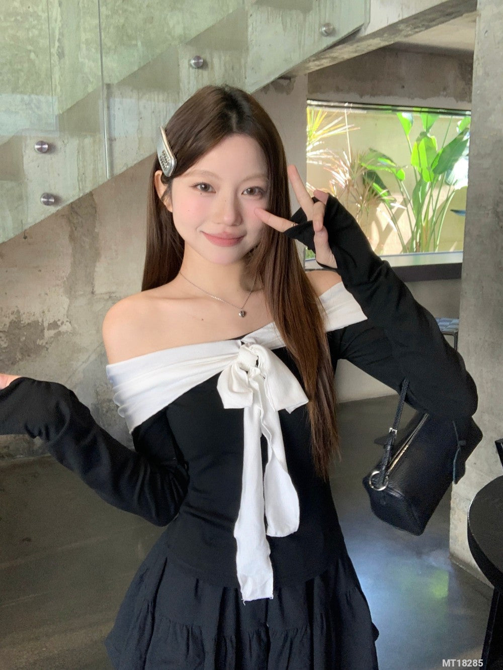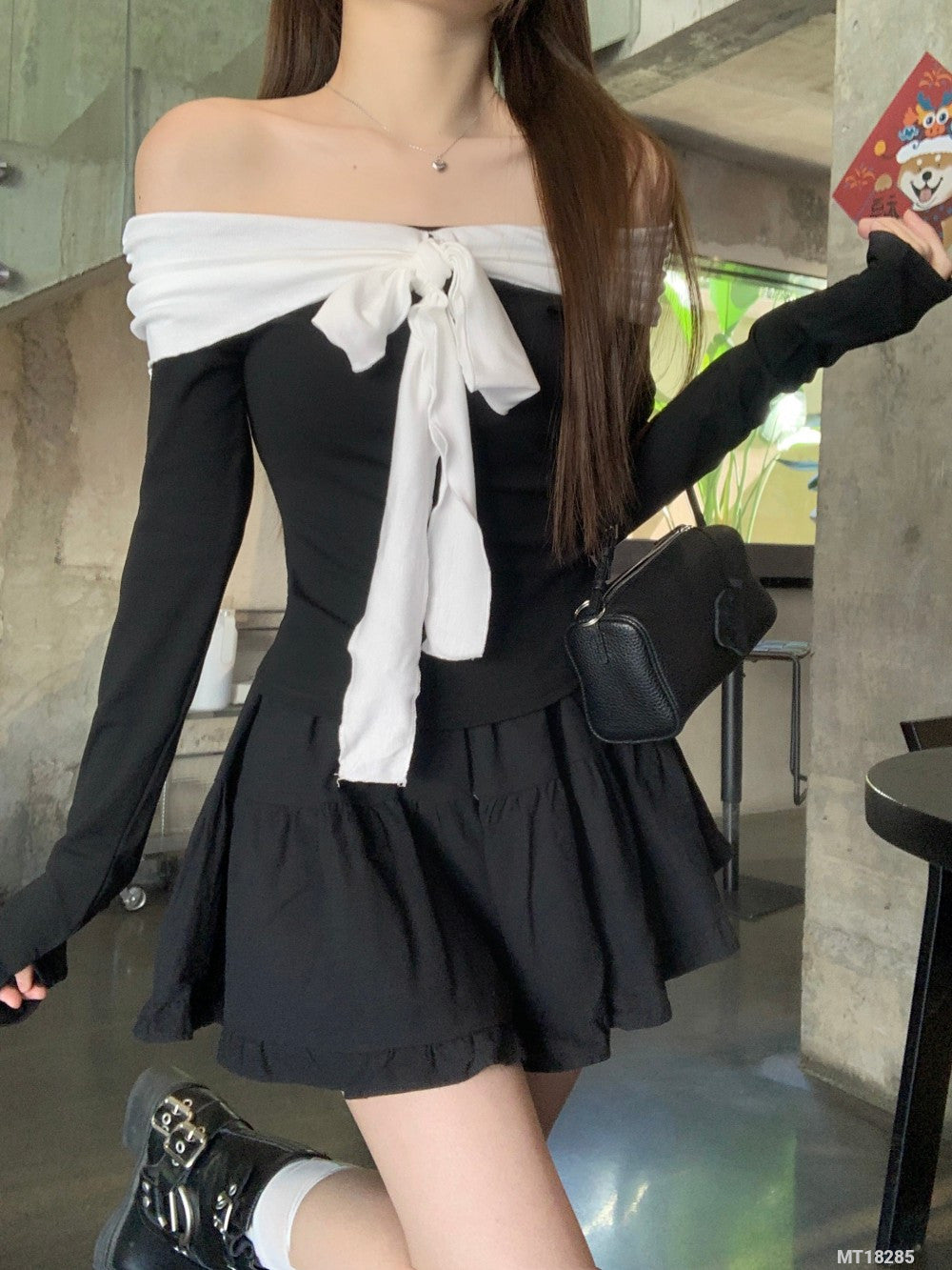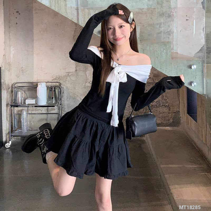 Black and white long-sleeved T-shirt with tie