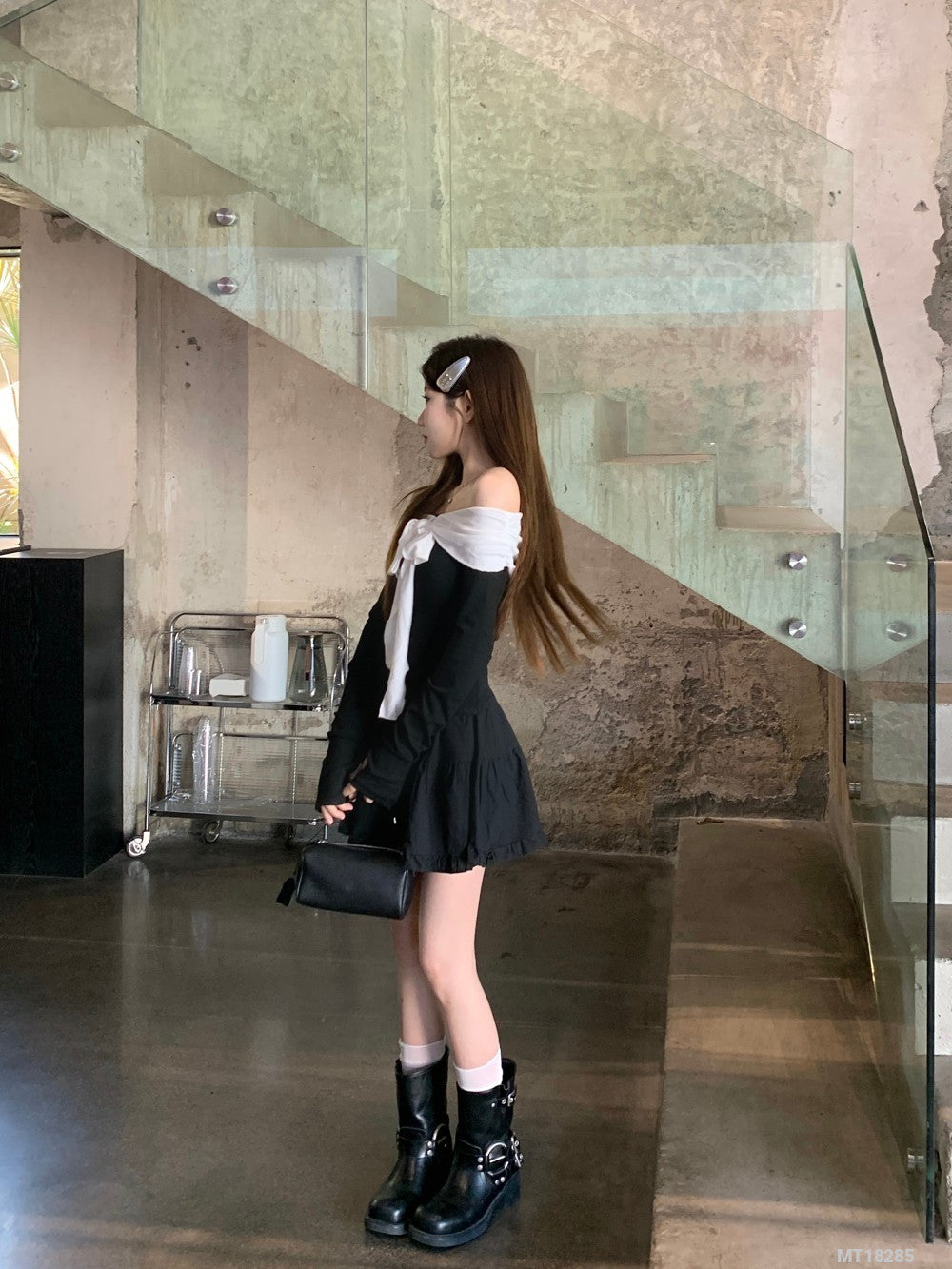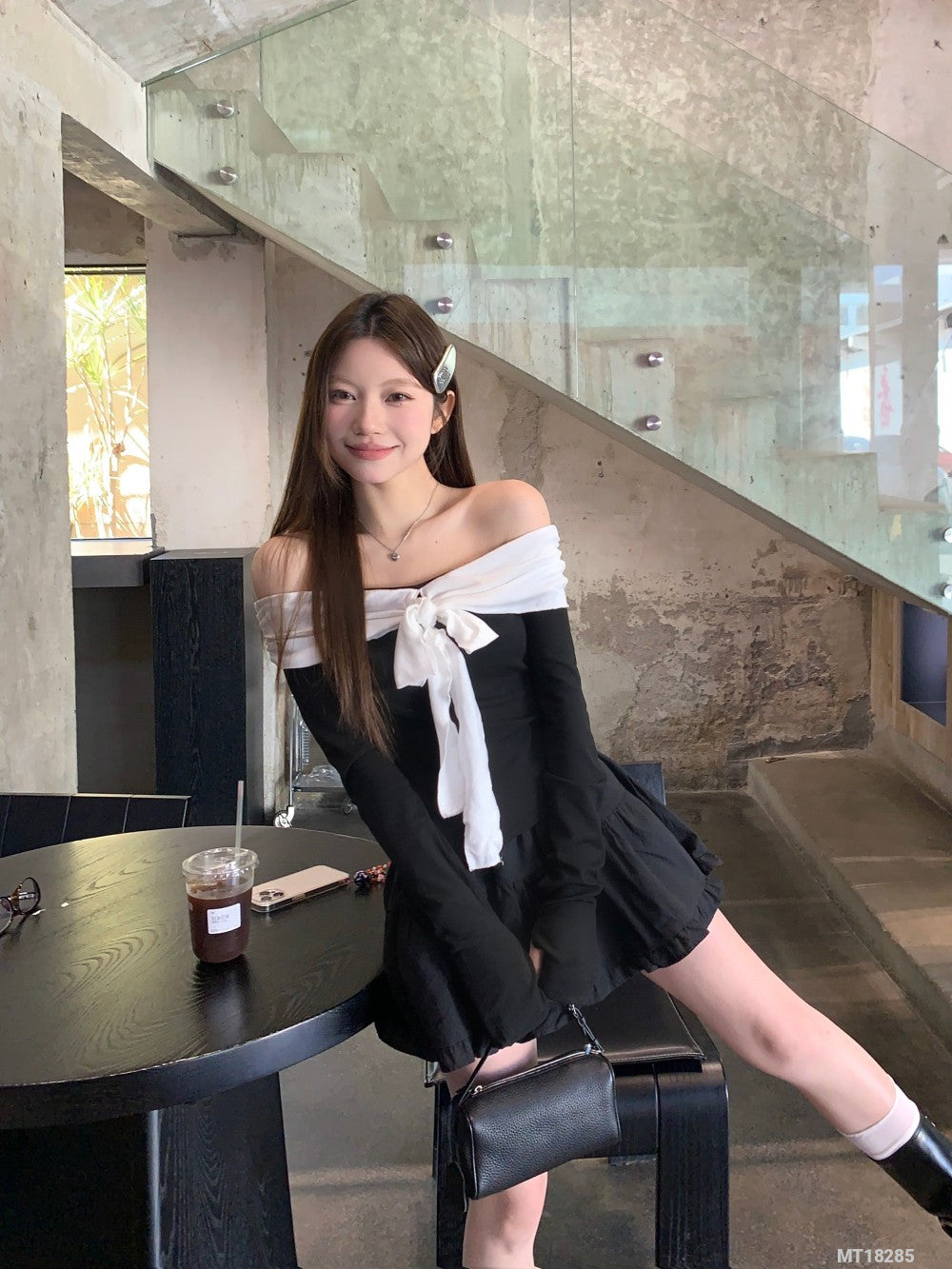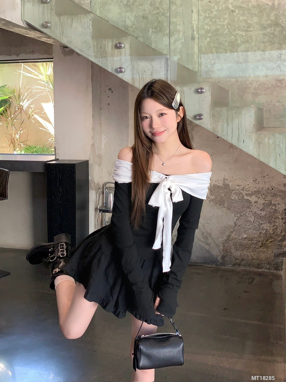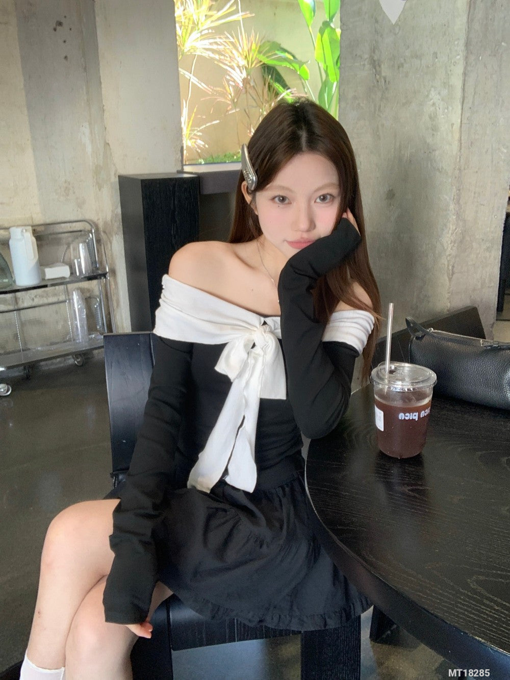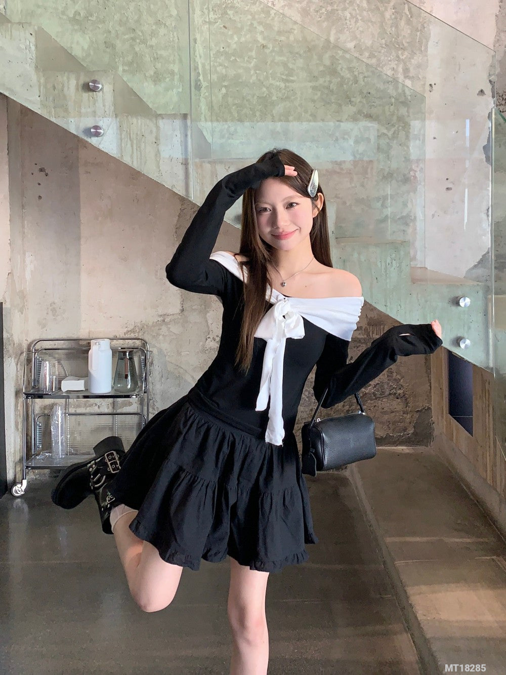 Black and white long-sleeved T-shirt with tie